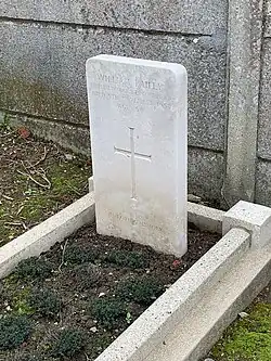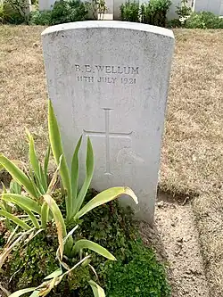 | Bernard Ernest Wellum | 11 July 1921 | Albert Communal Cemetery Extension | Died age 25. During the Great War, he served with the Royal Army Medical Corps.[4] His grave is unusual in that it is a standard CWGC war dead headstone, as opposed to the flat-topped stone or post war/civilian type stone.[5] | ![]() |