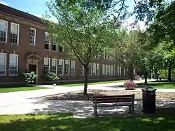 Waller Hall was constructed between 1926 and 1928 as the normal school's gymnasium. The first floor contained a primary and small gymnasium, while the lower level held a swimming pool.[23] Waller Hall was the venue for the university's men's and women's basketball team and men's wrestling team until the Memorial Field House opened in the 1960s.[24] Under a renovation project in 1989, the interior of Waller Hall was converted to serve as performance space for the Theater and Dance department, though the exterior remains the same as when it was first constructed.[25] After the renovation, Waller contains a black box theater, a studio stage, classrooms, and studio and office space. Waller holds productions by the university's production company, Theater-by-the Grove, and student-written and directed productions under the Acorn Project.[26]