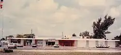 Pompano Beach, FL | Mid-Century modern style; front structure designed as early suburban shopping center (by Mackle's General Development Corporation) of 6,000 sq. ft. and built c. 1954; purchased in 1964 by Home Corporation of John A. Hill Council #4955; after expansions in 1968 and 1982 square footage increased to 16,982 sq. ft. Sold in 2000 to Archdiocese of Miami for use as church building. Property (on two acres of land) was sold by archdiocese in 2011 to Wal-Mart, which opened in 2013. |