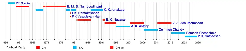 P.T. Chacko, T.K. Ramakrishnan, Ramesh Chennithala and incumbent Leader of the Opposition V.D. Satheesan have not served as Chief Minister. Conversely, Pattom A. Thanu Pillai, R. Sankar, C. Achutha Menon, C. H. Mohammed Koya and incumbent Chief Minister Pinarayi Vijayan have not served as Leader of the Opposition.