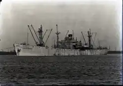 Nathaniel B. Palmer was a tanker built by California Shipbuilding Corporation. She was completed in November 1943.[24] To the United States Navy and renamed Caribou. Returned to WSA in May 1946 and renamed Nathaniel B. Palmer.[25] Sold in 1948 to Palmer Shipping Corp., Wilmington, Delaware.[6] Converted to a cargo ship at Newport News, Virginia in 1949.[25] Now 7,210 GRT.[6] She ran aground in the Martín García Channel on 31 May 1952 whilst on a voyage from Constitución, Argentina to Montevideo, Uruguay. She was refloated on 2 November. Although declared a constructive total loss,[25] she was sold in 1953 to Olmeda Compania Navigation, Panama, repaired and renamed Manolito. She was reflagged to Costa Rica and operated under the management of Marcou & Sons. Sold in 1960 to Pavia Compania Navigation and renamed Manegina. Reflagged to Lebanon, remaining under the same management.[6] She was scrapped at Savona in November 1962.[25]
