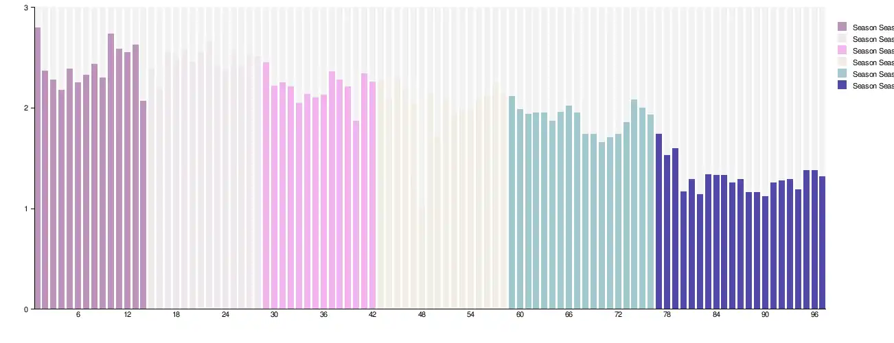 | Season 5 (2018) | 2.12 | 1.99 | 1.94 | 1.95 | 1.95 | 1.87 | 1.96 | 2.02 | 1.95 | 1.74 | 1.74 | 1.66 | 1.71 | 1.74 | 1.86 | 2.08 | 2.00 | 1.93 | – | |||