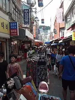 Major cities in South Korea typically have several traditional markets, each with vendors selling a wide variety of goods including fruit, vegetables, meat, fish, breads, clothing, textiles, handicrafts, souvenirs, and Korean traditional medicinal items.[1] The Korean word for market is sijang (Korean: 시장) and traditional street markets are called jaerae sijang (Korean: 재래시장) or jeontong sijang (Korean: 전통시장). The market space commonly includes permanent restaurants, pop-up restaurants and food stalls (pojangmacha, Korean: 포장마차, lit. 'covered wagon') that sell traditional Korean cuisine and street food.[2] The Small Enterprise and Market Service (Korean: 소상공인시장진흥공단; previously the Agency for Traditional Market Administration) is responsible for improving the condition of the country's traditional markets with the goal of developing them into prominent tourist attractions.[3][4]