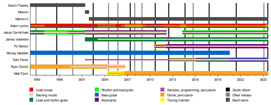 Maroon 5 is an American pop rock band from Los Angeles, California. The group originally formed in 1994 as Kara's Flowers with a line-up of Adam Levine (vocals, guitar), Jesse Carmichael (guitar, keyboards), Mickey Madden (bass) and Ryan Dusick (drums).[1] The band currently consists of Levine (a constant member) and Carmichael (who took a hiatus between 2012 and 2014), alongside lead guitarist James Valentine (since 2001), drummer Matt Flynn (since 2006), keyboardist PJ Morton (since 2012) and bassist Sam Farrar (since 2017).