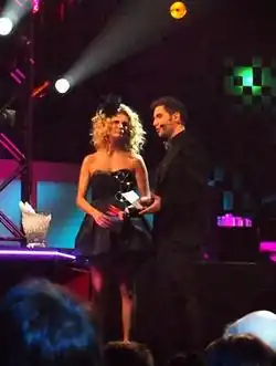Hosts Christine Meltzer and Måns Zelmerlöw during the second heat of Melodifestivalen 2010 in Sandviken .