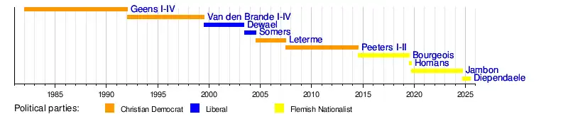 2024 | 30 September 2024 | Incumbent | 326 days | N-VA | Diependaele | N-VA, Vooruit, CD&V |