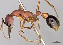 Roger[33] | 1861 | Specimens of this species are only known from workers collected in Queensland. The workers are large, measuring 21 to 22 millimetres (0.83 to 0.87 in). The head, node, thorax and postpetiole are red, the mandibles are yellow, and the antennae, clypeus and legs are reddish yellow. The gaster is black.[34] |
