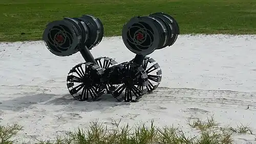 Pronounced "Razor", stands for Regolith Advanced Surface Systems Operations Robot. It is a lunar robot that will autonomously excavate soil when it is near completion, with its small tank like chassis with a Drum excavator and either side mounted on arms which can help the robot climb over obstacles that may be in its way. With these arms the robot can successfully right itself if it flips over and lift itself off the ground the clear its tracks of debris. With the drums positioned vertically RASSOR stands at about 2.5 ft. tall and expected to weigh about 100 pounds. With an average speed of about 20 centimeters per second (five times faster than the Curiosity rover's top speed on mars) the RASSOR will work 16 hours a day for many years (a minimum of 5 years as stated in the design requirements).[2] In its design NASA has moved away from its usual fragile and slow robot to design something more robust and hardy. The 2 excavating drums are designed to slowly remove soil into a hopper that can hold 40 pounds of material. The little robot will then drive to a processing plant where the lunar soil could be chemically broken down and converted into rocket fuel, water or breathing air for astronauts working on the moon and even possibly Mars. In-situ resource utilization of lunar soil for fuel could save the costs of launching a rocket as 90% of the rocket's weight consists of propellants.