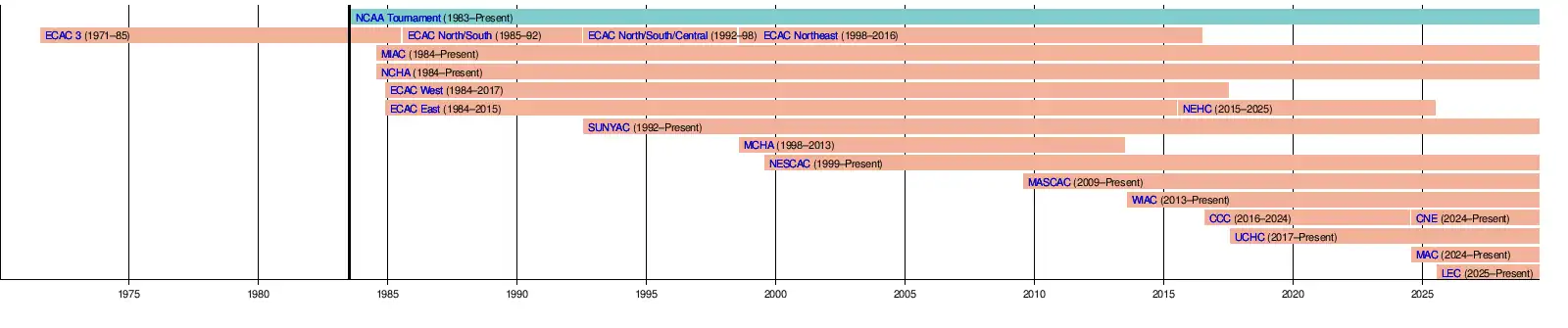 In the wake of COVID, Division III hockey saw many new programs while some also reappeared for the first time in many years. From 2021 to 2025, nine Division III schools founded ice hockey programs while three college restarted their dormant programs after at least 20 years away. However, due to financial difficulties that were exacerbated by the pandemic, three schools were forced to close permanently during the same time frame.[5] With all of the changes occurring, conference realignment was almost unavoidable and two all-sport leagues began sponsoring ice hockey for the first time. The Little East Conference and Middle Atlantic Conferences siphoned member teams out of the NEHC and UCHC respectively. While the UCHC was able to get enough new teams to sign on and remain a viable league, the NEHC saw almost all of remaining members leave for other conferences, effectively signaling an end for one of Division III's oldest leagues.[6]