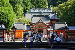 The number of Shinto shrines in Japan today has been estimated at more than 150,000.[1] Single structure shrines are the most common. Shrine buildings might also include oratories (in front of main sanctuary), purification halls, offering halls called heiden (between honden and haiden), dance halls, stone or metal lanterns, fences or walls, torii and other structures.[2] The term "National Treasure" has been used in Japan to denote cultural properties since 1897.[3] The definition and the criteria have changed since the inception of the term. The shrine structures in this list were designated national treasures when the Law for the Protection of Cultural Properties was implemented on June 9, 1951. As such they are eligible for government grants for repairs, maintenance and the installation of fire-prevention facilities and other disaster prevention systems. Owners are required to announce any changes to the National Treasures such as damage or loss and need to obtain a permit for transfer of ownership or intended repairs.[4] The items are selected by the Ministry of Education, Culture, Sports, Science and Technology based on their "especially high historical or artistic value".[5][6] This list presents 43[nb 1][nb 2] entries of national treasure shrine structures from 12th-century Classical Heian period to the early modern 19th-century Edo period. The number of structures listed is actually more than 43, because in some cases groups of related structures are combined to form a single entry. The structures include main halls (honden), oratories (haiden), gates, offering halls (heiden), purification halls (haraedono) and other structures associated with shrines.[6]