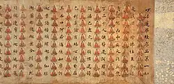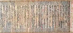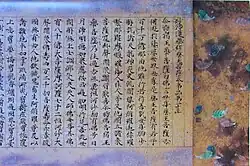 After the shakyōjo closed at the end of the 8th century, the imperial family and leading aristocrats continued to sponsor sutra copying.[18] Because of an enhanced belief in the powers of the Lotus Sutra, more Heian period copies of this sutra exist than of all other sutras combined.[25] Starting in the early Heian period, styles became flowery and ornate with lavish decorations as sutras were not used only in recitation but for dedication and sacrifice.[22][26][27] Devotional sutra copying was more often undertaken by the initiator than in the Nara period.[8][25] New forms of decoration came in fashion by the early-11th century including placing each character in the outline of a stupa, on lotus pedestals or next to depictions of Boddhisattvas.[28][29] Sutras were increasingly furnished with frontispieces starting in the 11th century.[28] Calligraphy shifted from Chinese to Japanese style.[30] Sutra copying continued into the Kamakura and subsequent periods, but only rarely to comparable artistic effect.[29] With the import of printed Song editions in the Kamakura period, hand-copying of the complete scriptures died out and sutra copying was only practiced for its devotional aspect.[31][32] Fifty-one sutras or sets of sutras from the 6th century Western Wei to 14th century Nanboku-chō period have been designated National Treasures. Some of the oldest items in this list originated in China.[4]