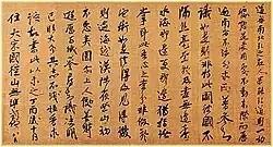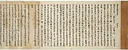 The list contains various types of written materials such as sutra copies, Buddhist commentaries and teachings, poetry and letters. Some of the designated objects originated in China, and were imported at a time when writing was being introduced to Japan. The items in this list were predominantly made with a writing brush on manuscript scrolls, which was the preferred medium until the advent of commercial printing and publishing in the 17th century.[5] In many cases the manuscripts are noted examples of calligraphy. They are housed in temples, museums, libraries or archives, shrines, universities and in private collections.[4] The writings in this list represent about half of the 235 National Treasures in the category "writings". They are complemented by 71 Japanese and 57 Chinese book National Treasures of the List of National Treasures of Japan (writings: Japanese books) and the List of National Treasures of Japan (writings: Chinese books).[4]