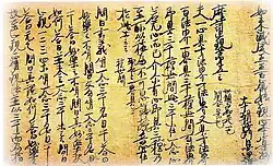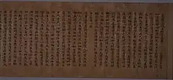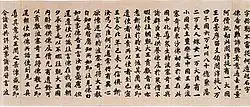 The concept of writing came to Japan from the Korean kingdom of Baekje in the form of classical Chinese books and sutras, likely written on paper and in the form of manuscript rolls (kansubon).[6][7][8][9] This probably happened at the beginning of the 5th century (around 400), and certainly in conjunction with the introduction of Buddhism in the 6th century.[7][10] The increasing popularity of Buddhism, strongly promoted by Prince Shōtoku (574–622), in the late-6th century and early-7th century was one of the factors[nb 3] leading to a rise in the importance of writing.[11] Buddhism required the study of sutras in Chinese. To satisfy the growing demand for them, imported Sui and Tang manuscripts were copied, first by Korean and Chinese immigrants, and later in the mid-7th century by Japanese scribes.[12][13] The Sangyō Gisho ("Annotated Commentaries on the Three Sutras"), traditionally attributed to Prince Shōtoku, is the oldest extant Japanese text of any length.[14] By 673 the entire Buddhist canon had been systematically copied.[8][15] Not a single sutra survives from before the end of the 6th century.[16] The oldest extant complete sutra copied in Japan dates to 686 and has been designated a National Treasure.[15][17] During the 7th and 8th centuries, the copying of Buddhist texts, including sutras, dominated writing. Few Chinese secular or local Japanese works (which were rare) were copied.[17] The state founded a Sutra Copying Bureau (shakyōjo) before 727[nb 4] with highly specialized calligraphers, proofreaders and metal polishers to satisfy the large demand for Buddhist texts.[8][11][14][15][18] Sutra copying was not only for duplication but also to acquire religious merit;[15][19] thus nearly all Buddhist texts were hand-copied during the 8th century despite knowledge of printing.[14]