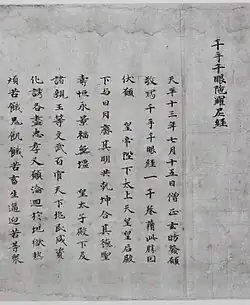 | Segment of the Sutra of the Incantation of the one thousand armed, one thousand eyed Avalokiteśvara Bodhisattva (千手千眼陀羅尼経残巻, senju sengen daranikyō zankan)[42] | Genbō (玄昉) | Only extant portion of one thousand copies of the Senju sengen daranikyō made by Genbō; mentioned in the Essential Records of Tōdai-ji (東大寺要録, tōdaiji yōroku); total of 109 lines; beginning of scroll is lost | Nara period, 741 | One handscroll, ink on paper, 25.5 cm × 246.0 cm (10.0 in × 96.9 in) | Kyoto National Museum, Kyoto | |