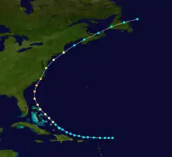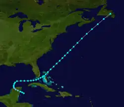 | Unnamed | Tropical storm | October 7, 1893 | Fortune, Newfoundland and Labrador | Southern Coast | Unknown | Yucatán Peninsula, Florida, The Bahamas[nb 3] | ![]() |