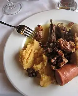 - Fårikål – the national dish of Norway, consisting of pieces of mutton with bone, cabbage, whole black pepper and occasionally a little wheat flour, cooked for several hours in a casserole, traditionally served with potatoes boiled in their skins.[43]