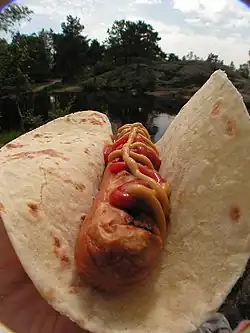 - Pølse i lompe – a kind of Norwegian fast food consisting of a sausage in a lompe, popular during children's birthdays, Saint John's Eve, and on the Constitution Day. Often served with raw onion, crispy-fried onion, ketchup, mustard, potato salad, shrimp salad, cheese, or bacon.[66]