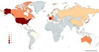 - ^ Surfing events were held in France's overseas collectivity of French Polynesia, where there is a separate NOC that is not a member of the International Olympic Committee.[25]