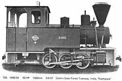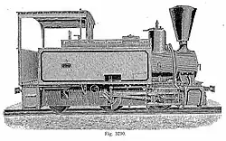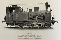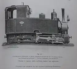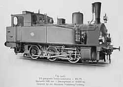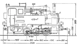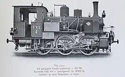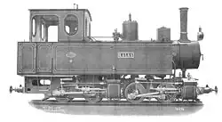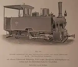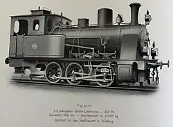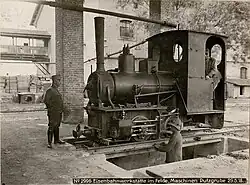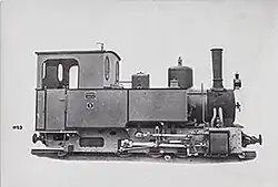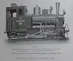 0-4-0 | 1,000 mm (3 ft 3+3⁄8 in) | 125 hp | Two-cylinder compound locomotive with two coupled axles. Supplied to the Ruhr-Lippe-Kleinbahnen. Steam bell, vacuum brake (König system), central lubrication device | |