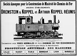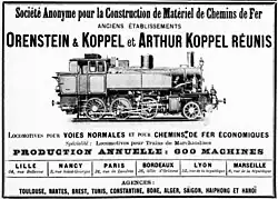 The list of Orenstein & Koppel steam locomotives shows photographically documented samples of representative Orenstein & Koppel (O&K) steam locomotives. The factory produced 14,387 steam locomotives from 1899 to 1945 at its Berlin site (Drewitz, Nowawes, Babelsberg) with the works number range from 337 to 12965.