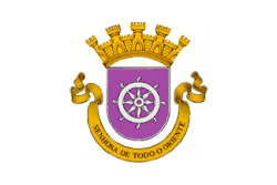 Heraldic banner (Five blue escutcheons each charged with an undetermined number of bezants on a white field. Border: red with yellow castles and a green cross of the Order of Aviz).