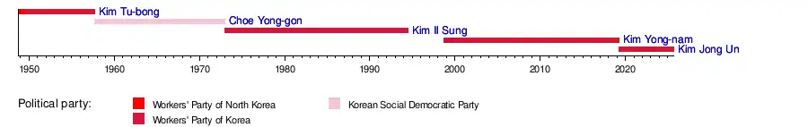 9 September 1948 | 20 September 1957 | 9 years, 11 days | Workers' Party of North Korea | 1st SPA | Kim Il Sung | |