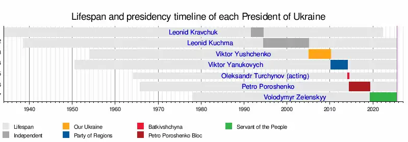 Every president of Ukraine except for Volodymyr Zelenskyy has been a People's Deputy of the Verkhovna Rada prior to their election, with Kuchma, Yushchenko, and Yanukovych all previously serving as Prime Minister and Kravchuk as well as acting president Turchynov previously serving as Chairman of the Verkhovna Rada. Kravchuk was the first president to resign from the office, following a power struggle with Prime Minister Leonid Kuchma. After the 2014 Ukrainian revolution, Viktor Yanukovych abandoned the office and fled the country. He was subsequently impeached and temporarily replaced by Chairman of the Verkhovna Rada Oleksandr Turchynov; the chairman serves as acting president when the office is vacant. Early presidential elections were held on 25 May 2014 and won by Petro Poroshenko; Poroshenko was inaugurated as the fifth president on 7 June 2014. On 18 June 2015, Yanukovych was officially deprived of the title of President of Ukraine.[3] The sixth and current president is Volodymyr Zelenskyy, who defeated Poroshenko in the 2019 presidential election and was inaugurated on 20 May 2019.