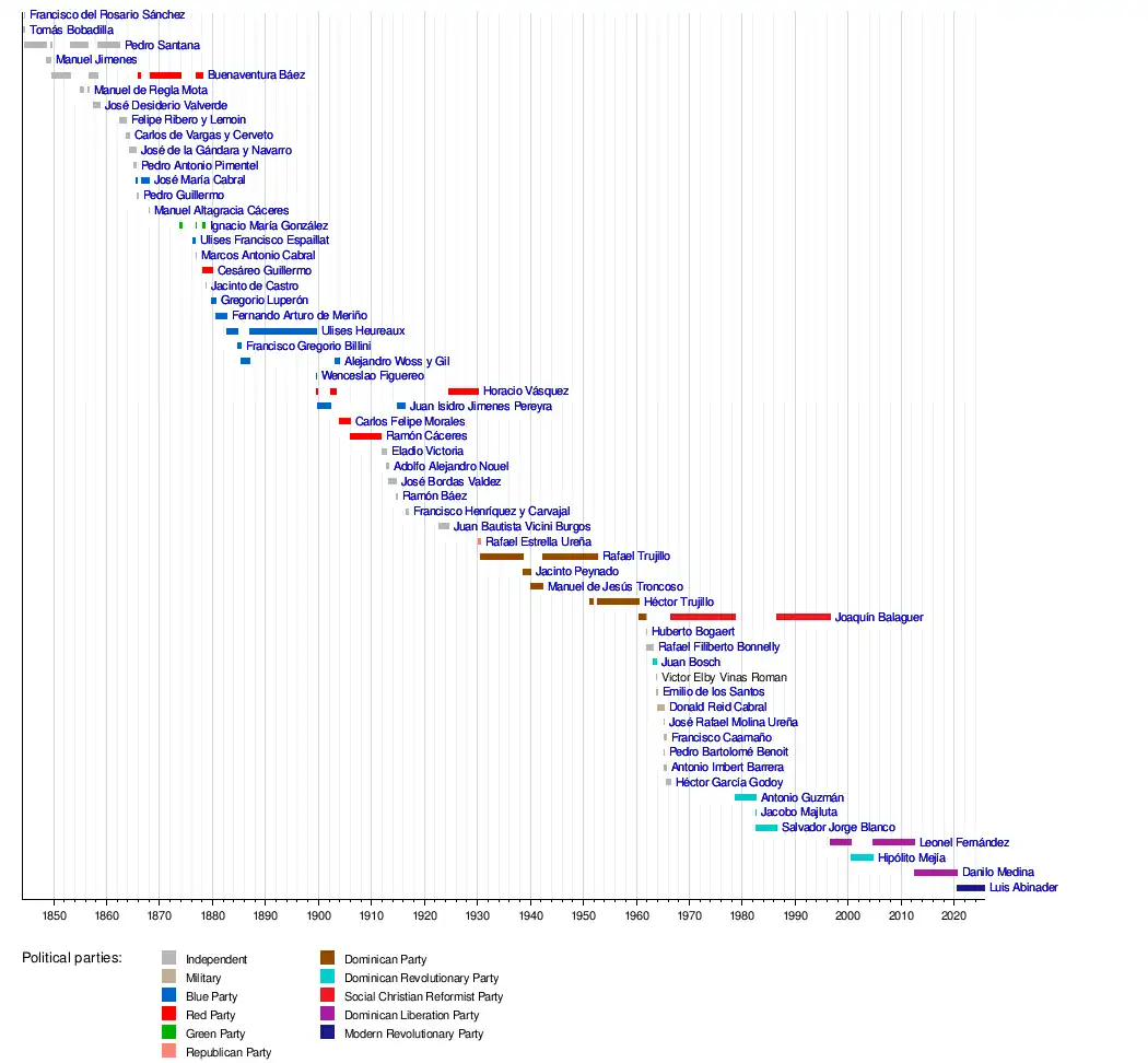 Since independence in 1844, the Dominican Republic has counted 54 people in the presidential office, whether constitutional, provisional, or interim, divided into 66 periods of government. Likewise, there are also periods in which the head of state role has been exercised by collegiate bodies (such as triumvirates, military juntas, or councils of state).[1][2]