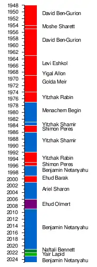 - ^ Rabin's first tenure includes a period of 60 days at the end wherein Rabin had stepped aside and Peres was the de facto prime minister. Due to the government being a caretaker government and laws preventing caretaker prime ministers from resigning, Rabin remained prime minister de jure during the period.