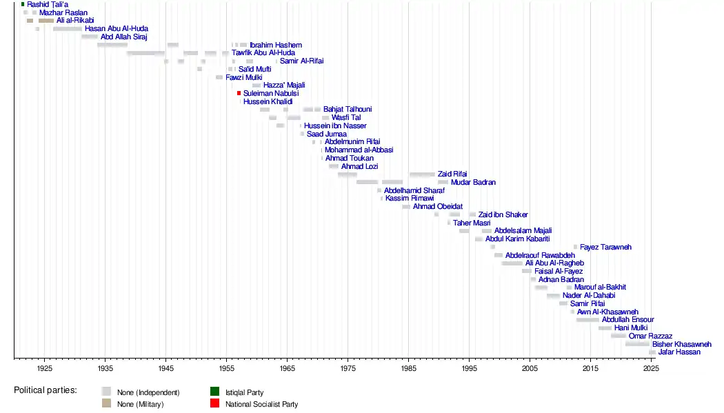 Since the establishment of the state as the Emirate of Transjordan in 1921, 44 people have held the position of prime minister, several of whom have served multiple non-consecutive terms. Tawfik Abu Al-Huda served for a total of 12 years and is considered the longest-serving prime minister.