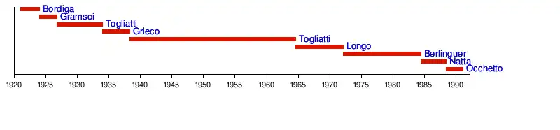 This is a list of national secretaries of the Italian Communist Party. Until 1926 though the office of secretary did not exist. Amadeo Bordiga and Antonio Gramsci were members of the Executive Committee and Central Committee in the Communist Party of Italy (PCd'I).