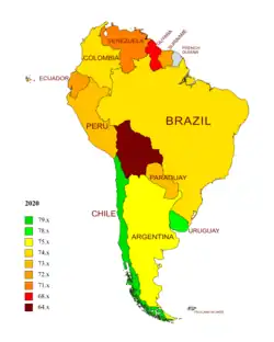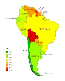 Estimation of the World Bank Group for 2023.[2][3][4] The data is filtered according to the list of countries in South America. The values in the World Bank Group tables are rounded. All calculations are based on raw data, so due to the nuances of rounding, in some places illusory inconsistencies of indicators arose, with a size of 0.01 year.