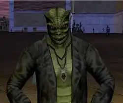 Rodians are a species of green, antenna-sporting, bug-eyed humanoids from the planet Rodia. The Rodians are born hunters; they killed most of the wildlife and grew restless with the lack of creatures and began to hunt each other in gladiatorial combat, until the Republic found them. Many continued to hunt as bounty hunters; the most notable specimen was Greedo, the bounty hunter shot by Han Solo in the Mos Eisley cantina in the original Star Wars movie. In the 1997 special edition of Return of the Jedi, two Rodians were added, one named Greeata who served as a dancer in Jabba the Hutt's palace on Tatooine, and Doda Bodonawieedo (picture on right), a member of the Max Rebo Band who plays the flute. A young Rodian named Wald (played by Warwick Davis), a friend of Anakin Skywalker, appears in The Phantom Menace. In Attack of the Clones, Rodians are represented by Senator Onaconda Farr, and Palpatine's aide Dar Warc. Rodians were one of the species playable in Star Wars: Galaxies.