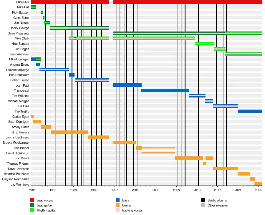 Suicidal Tendencies is an American crossover thrash band from Venice, California. Formed in 1980, the group originally featured vocalist Mike Muir, guitarist Mike Ball, bassist Mike Dunnigan, and drummer Carlos "Egie" Egert. Muir is the band's only constant member, the current lineup of which features guitarists Dean Pleasants (since 1996) and Ben Weinman (since 2018), bassist Tye Trujillo (since 2021), and drummer Jay Weinberg (since 2024).