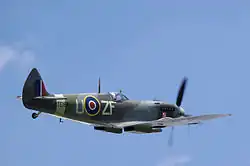 - Spitfire LF Mk.IXe PL344 (VH-IUK). Served with 602 Squadron, 442 Squadron and 401 Squadron during the war then 130 Squadron and finally No. 129 Squadron RAF before suffering a wheels-up landing in 1946. Rebuilt to airworthy condition in 1991 with the registration G-CCIX. Kermit Weeks acquired the Spitfire in 1992 and was rebuilt again to near-original condition. Completed in 2000 and registered as N644TB[10] as a birthday gift for Tom Blair from his wife, Alice Blair, who bought it from Kermit Weeks. Airworthy until it was exported to the UK in 2007. Rebuilt for a third time including the fitting of fuel tanks in the wings before a post-rebuild first flight in 2007. Returned to America some time after,[11] UK registration was cancelled in September 2020 and the aircraft was exported to Australia"[4]in 2021 as VH-IUK in Australia.[12] After some time in preparation, the aircraft was repainted in its 401 Squadron markings of YO-K and flew in Australia on 11 June 2022.