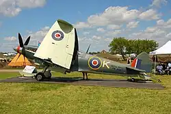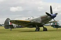 - Spitfire FR Mk.XIVe TZ138 (C-GSPT). Was built in early 1945 and served in the RAF before joining the Royal Canadian Air Force later that year for cold weather tests, even at one point fitted with skis that came off a Tiger Moth.[34] After military retirement, it was exported and registered in the United States with various registrations and participated in many air races. By the 1970s it became a restoration project and was rebuilt to airworthy condition in the US in 1999 before being exported to Canada with the registration C-GSPT.[35]
