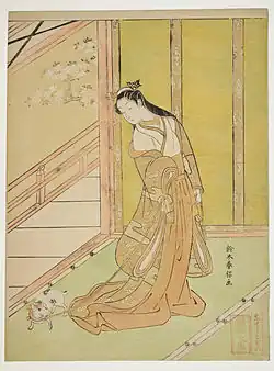 - Lady Murasaki (Murasaki no Ue) – She is the daughter of Prince Hyōbu by a minor consort and related to Fujitsubo on her father's side (Hyōbu is Fujitsubo's brother, hence Murasaki is Fujitsubo's niece). She makes her debut into the tale as a substitute for her unattainable aunt, but she gradually outshines Fujitsubo in Genji's and the readers’ eyes, turning into “a substitute for all seasons.”[2]: 160 In fact, her very name, “Murasaki” translated as “Lavender,” plays on the similarity of two colors (the color “murasaki” is purple of a darker hue than “fuji”, wisteria, of Fujitsubo's name). Discovered by Genji in the Northern Hills when she is only ten, she is taken into his Nijō residence after the death of her grandmother (the episode of her kidnapping has definite violent undertones) where she is molded into Genji's ideal woman, not unlike the myth of Galatea, with whom she is often compared.[8] She remains Genji's most important lover throughout the tale, but, because of her imperfect social status (she is of royal blood on her father's side, but her mother was a commoner), she can never be acknowledged as Genji's main wife (kita no kata). For that reason, her position is perpetually insecure, especially when Genji's attention shifts to other women including Akashi, Asagao, but most importantly, the Third Princess. Childless her entire life, Murasaki can only adopt Genji's daughter by the Akashi Lady and raise her to become an empress. Towards the end of her life, she repeatedly expresses her desire to become a nun, but meets Genji's resolute opposition. She becomes the victim of spirit possession in chapter 35 (the aggressor is once more identified as Rokujō, though this interpretation has been debated [5]) and dies in chapter 40 without having realized her wish. Murasaki as a character of the Genji has triggered much debate among scholars. Some see her as an utterly miserable character,[8] while others claim that her relationship with Genji is the best things that could have happened to a woman of Murasaki's status.[9] The beauty of this character resides precisely in its complexity. (chapters 5–40)