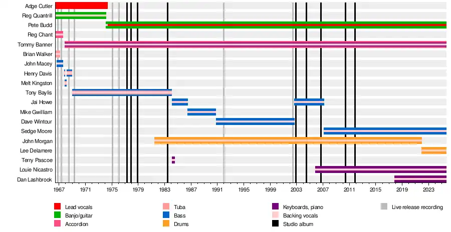 | Adge Cutler | 1966–1974 (died 1974) | lead vocals | all Wurzels releases from Scrumpy & Western (1967) to "Little Darlin'" (1972) | |