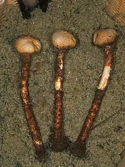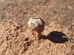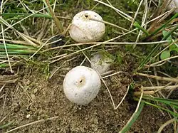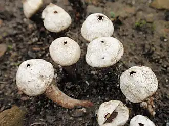 Tulostoma is a genus of over 100 species of fungi in the family Agaricaceae. Commonly known as stalked puffballs, the cosmopolitan genus consists of species which produce small fruit bodies, characterized by stalks inserted in a socket at the base of the spherical spore-sac opened by a small and apical mouth. The spore-sac contains gleba, a mixture of spores and associated cells; at maturity, the spores are released through one or more apical pores. Tulostoma species prefer xeric microhabitats, savannahs and deserts, and are saprobic—obtaining nutrients by decomposing roots, buried wood and other organic material of plant origin.[1]