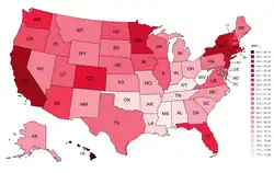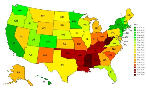 The life expectancy at birth in each U.S. state and the District of Columbia from 2019 to 2021, according to the National Center for Health Statistics.[9][4][10]