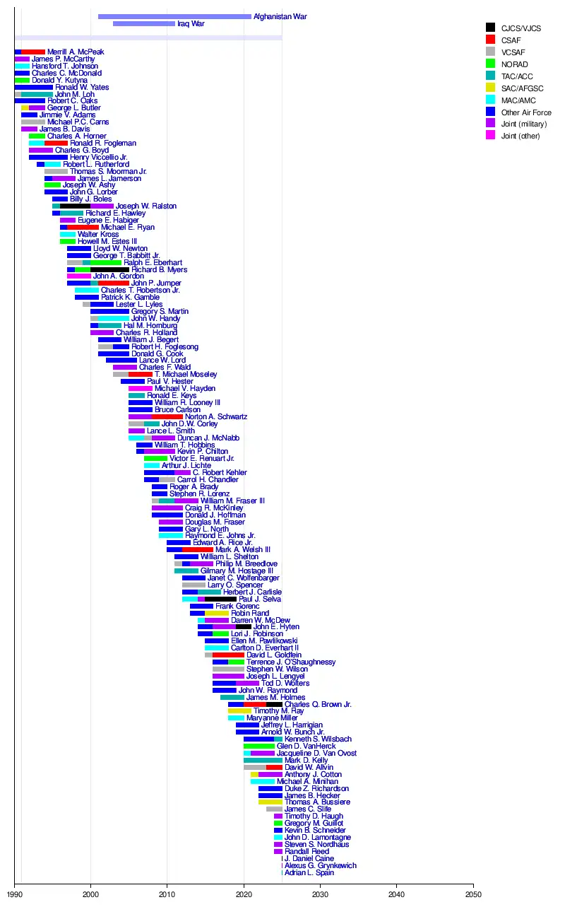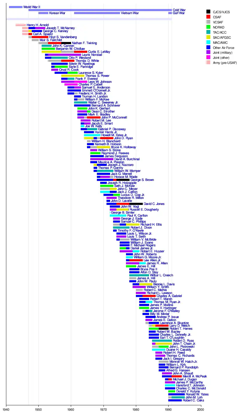 - ^ Positions listed are those held by the officer when promoted to general. Dates listed are for the officer's full tenure, which may predate promotion to four-star rank or postdate retirement from active duty.