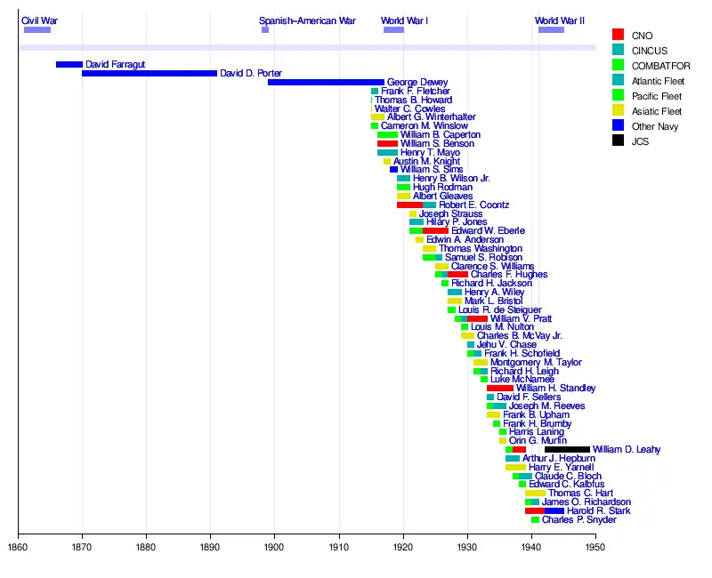- ^ a b Dates of rank are taken, where available, from the Dictionary of American Naval Fighting Ships, or from the U.S. Navy register of active and retired commissioned officers, or from the World Almanac and Book of Facts. The date listed is that of the officer's first promotion to admiral, and may differ from the officer's entry in the U.S. Navy register, which lists admirals who reverted to their permanent ranks of rear admiral as ranking from the date of the legislation that ultimately restored them to the rank of admiral, not from the dates of their original appointments.