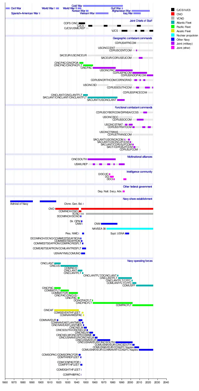 By 1956, the Navy had equilibrated at a total of seven permanent billets bearing four-star rank: the Chief of Naval Operations (CNO); the Vice Chief of Naval Operations (VCNO), the commanders in chief of the unified commands in the Pacific (CINCPAC) and Atlantic (CINCLANT); the commander in chief of the U.S. Pacific Fleet (CINCPACFLT); the commander in chief of U.S. Naval Forces, Eastern Atlantic and Mediterranean (CINCNELM) (retitled commander in chief of U.S. Naval Forces Europe (CINCUSNAVEUR) in 1960); and the commander in chief of North Atlantic Treaty Organization (NATO) forces in Southern Europe (CINCSOUTH). In 1965, an eighth billet was added when the chief of naval material (CNM) was promoted to admiral. Occasionally this count would fluctuate when a Navy officer was selected as the Chairman of the Joint Chiefs of Staff (CJCS), as the chairman's four-star representative to the NATO Military Committee (USMILREP), or as the director or deputy director of central intelligence; or by special legislation.[23]