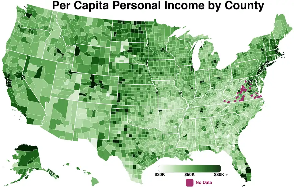 The list below excludes the 8 county-equivalents in the U.S. territories that have zero people (Baker Island, Howland Island, Jarvis Island, Johnston Atoll, Kingman Reef, Navassa Island, Northern Islands Municipality and Rose Atoll)—all of these county-equivalents have a per capita income of $0 because no one lives in them. The 3 semi-populated county-equivalents in the U.S. Minor Outlying Islands (Midway Atoll, Palmyra Atoll and Wake Island) are also excluded (total excluded: 11).