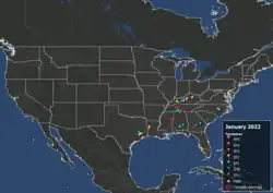 This page documents all tornadoes confirmed by various weather forecast offices of the National Weather Service in the United States from January to March 2022. In a recent 2000–2020 period, an average January features 32 tornadoes across the United States, the lowest month in a given year;[1] the broader 1991–2010 climatology is slightly higher at 35. An additional 36 tornadoes are recorded in February, and about 80 tornadoes are recorded in March.[2] These tornadoes are commonly focused across the Southern United States due to their proximity to the unstable airmass and warm waters of the Gulf of Mexico,[1] as well as California in association with winter storms.[3] The year's first tornado, part of a broader outbreak on New Year's Day, caused EF2 damage on the Enhanced Fujita scale in Hopkinsville, Kentucky, a region hit particularly hard from one of the deadliest and largest December outbreaks on record.[4]