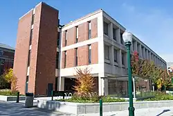 University of Oregon real estate includes buildings in a variety of architectural styles and eras. Many buildings on the main campus were designed by Ellis F. Lawrence, who joined the university in 1914 as campus planner, but by 1915 he had founded the School of Architecture and had become chief architect of the university. Lawrence also held a commission to design all buildings on campus as long as he remained in charge of the School of Architecture. This commission was a source of extra income for Lawrence, and he designed buildings until his death in 1946.[1] Some of the Lawrence buildings are listed on the National Register of Historic Places. Others are not themselves listed but are included in NRHP site surveys. The Memorial Quadrangle, for example, contains buildings listed as contributing resources in the site survey for the Knight Library.[2] These buildings are Condon Hall, Chapman Hall, and the Jordan Schnitzer Museum of Art, although the museum is also separately listed.[3] The Women's Memorial Quadrangle is listed on the NRHP, and it contains three more Lawrence buildings which are contributing resources, Gerlinger Hall, Hendricks Hall, and Susan Campbell Hall.[4]