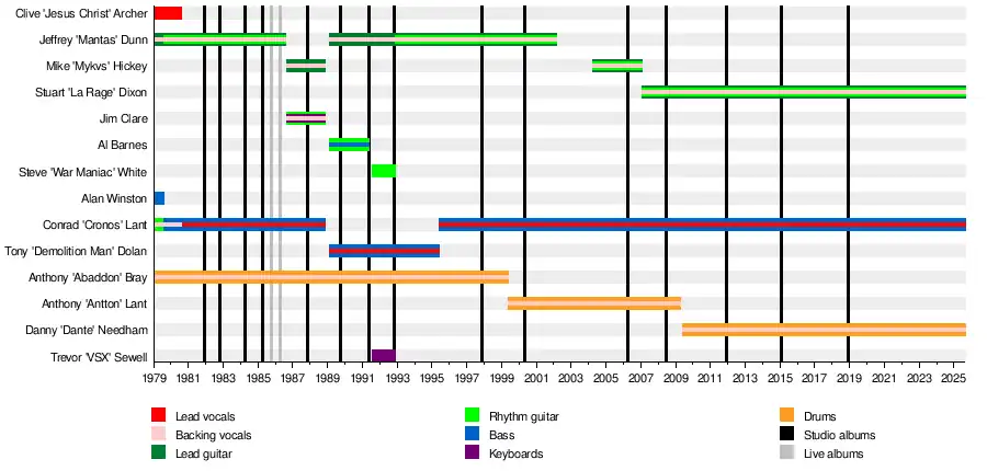 Abaddon, the only remaining constant member of Venom, left the group in 1999 and was replaced by Cronos' brother Anthony "Antton" Lant.[4] In February 2002, Venom was put on hiatus after Cronos was injured in a climbing accident.[8] The group returned in 2004, with Hickey (now under the name "Mykvs") returning to replace the departed Mantas.[9] Mykvs was later replaced by Stuart "La Rage" Dixon in early 2007.[10] Antton then left to focus on his other band Def-Con-One in 2009,[11] with Danny "Dante" Needham taking his place a month later.[12]