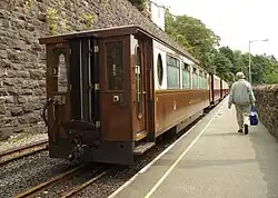 | 23 | 1894 | Ashbury Carriage & Wagon Co | 7 compartment | 42 | ![]() Built for the North Wales Narrow Gauge Railways became Welsh Highland Railway property in 1923 and was reduced in height to fit the FR loading gauge. Became Ffestiniog Railway property (in exchange for three bogie wagons) in 1926. Prior to this exchange, this carriage had been WHR No 24. Subsequent to the exchange, the number "24" was allocated to Ashbury "Corridor" No. 23, re-establishing the division between FR and WHR stock in the combined stock list. No 23 returned to FR service in 1955 and full doors fitted in 1966. Refurbished in 2002 and returned to the WHR. |