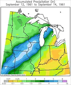 - September 12–14, 1961 — The extratropical remnants of Hurricane Carla bring 54 hours of rainfall to much of the Upper Midwest, with the heaviest rains occurring along a swath from Missouri to Wisconsin.[12] Accumulations peak at 7.58 in (193 mm) in Brodhead,[11] the highest on record for the state from a tropical cyclone's remnants.[13] This equated to the average rainfall for September, October, and November combined. Overall effects were relatively limited and farmers welcomed the precipitation due to an ongoing drought. Brodhead recorded 4.48 in (114 mm) of rain in a 24-hour period, a record for the month of September. Some creeks and rivers overtopped their banks, leading to flooding on highways.[12] Slippery roads led to a car hydroplaning into an embankment, injuring the two occupants.[14]