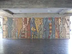 Villanueva approached Armando Barrios in 1952[18] to create a number of murals for the campus. Barrios' murals are mosaics made of glass, and are considered part of his "abstract-geometric" period. After 1954, his work became less abstract and incorporated more identifiable human figures.[19] As a music lover, Barrios incorporated a musical flow into his designs.[20]